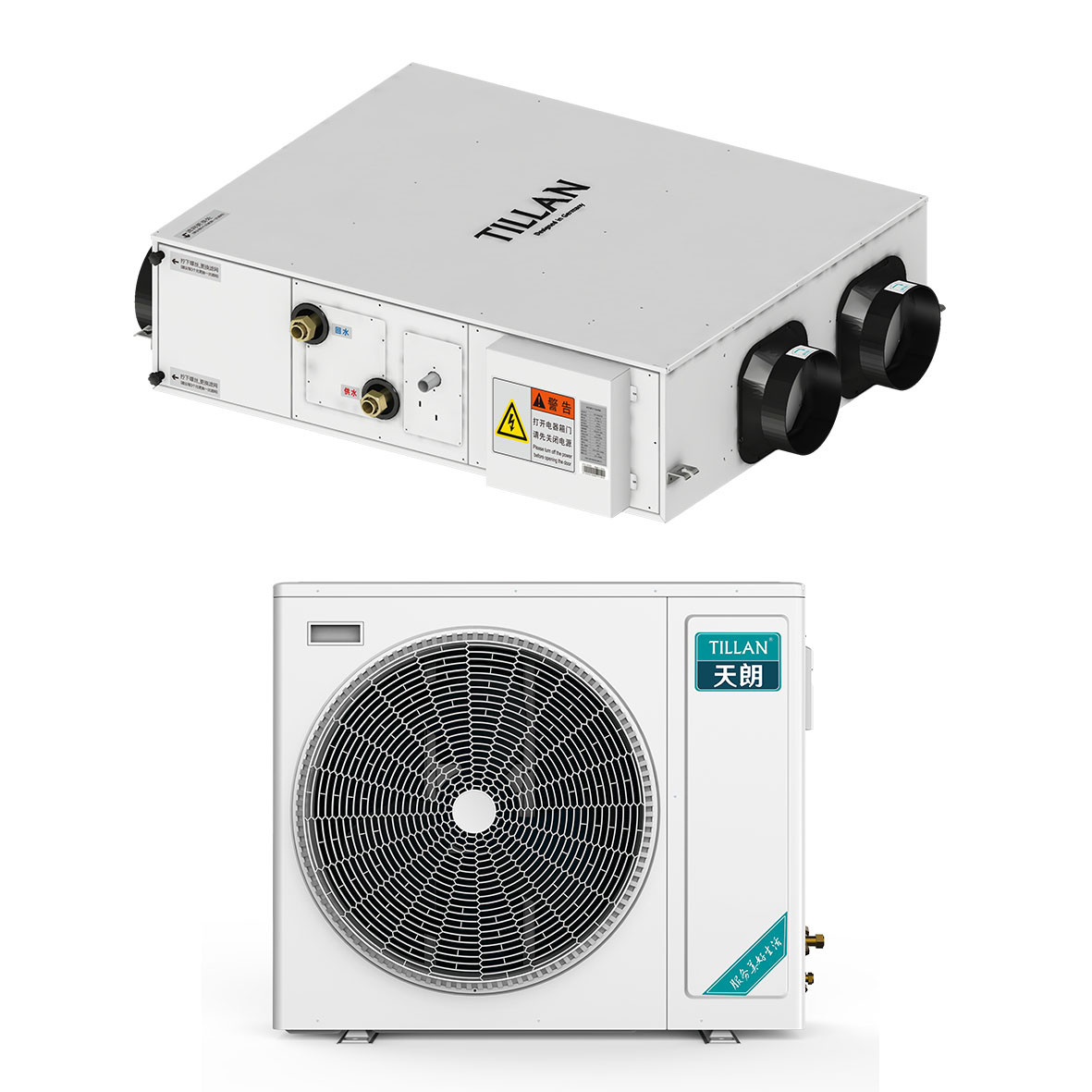 全直流變頻分體雙冷源直膨空氣處理機(分體吊頂式) FXF17.2-D100/DSF1E7.5 | 【直流變頻雙轉子壓縮機,額定送風量800-1200m3/h,新風量0-1200m3/h,機外余壓0-200pa,機組噪音:內39dB(A)/外55dB(A),額定除濕量13.9-20.8L/h,額定功率2150W,最大功率2950W,機組重量:內59kg/外68kg,R410a環(huán)保冷媒2.2kg,空氣側過濾器:G4+F9,標配:冷凝水提升泵、空氣質量傳感器,選配:內置加濕模塊,內機尺寸:1100×890×310mm,外機尺寸:925×365×795mm】 | 配套≤400㎡五恒系統(tǒng) 或≤600㎡二聯供系統(tǒng) |
