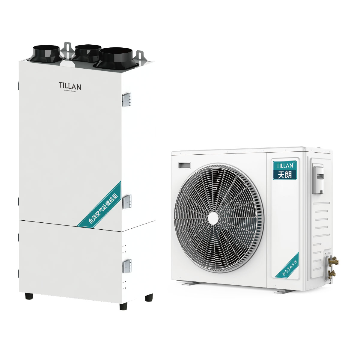 全直流變頻分體直膨空氣處理機(分體立柜式) FXF8.8-L50/DF1D7.5 | 【直流變頻雙轉子壓縮機,額定送風量500m3/h,新風量0-500m3/h,機外余壓0-200pa,機組噪音:內36dB(A)/外55dB(A),額定除濕量8.8L/h,額定功率2150W,最大功率2950W,機組重量:內66kg/外55kg,R410a環(huán)保冷媒2.2kg,空氣側過濾器:G4+F9,標配:冷凝水提升泵、空氣質量傳感器,選配:內置加濕模塊,內機尺寸:700×390×1380mm,外機尺寸:925×365×795mm】 | 配套≤150㎡五恒系統(tǒng) 或≤250㎡其它空調系統(tǒng) |